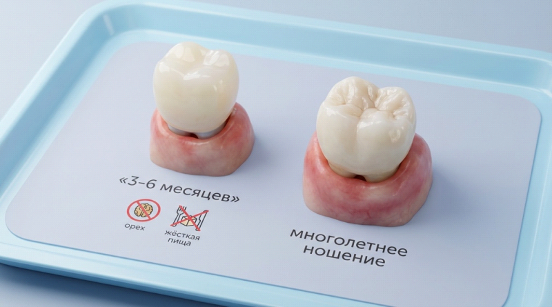 Обычно временную конструкцию носят 3–6 месяцев, пока идёт остеоинтеграция. Длительное ношение повышает риск сколов и износа материала.