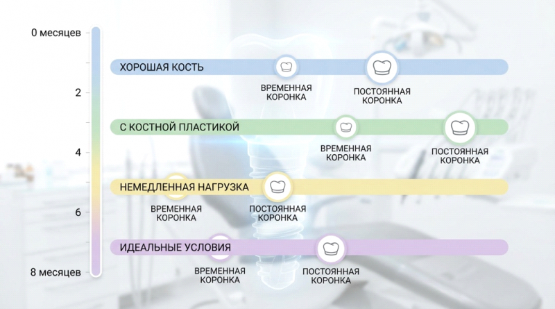 Срок установки постоянной коронки зависит не от даты в календаре, а от состояния кости, зоны имплантации, стабильности импланта и сопутствующих заболеваний. В среднем коронку фиксируют через несколько месяцев, но при сложных условиях срок увеличивается.