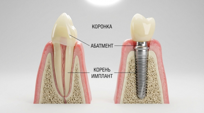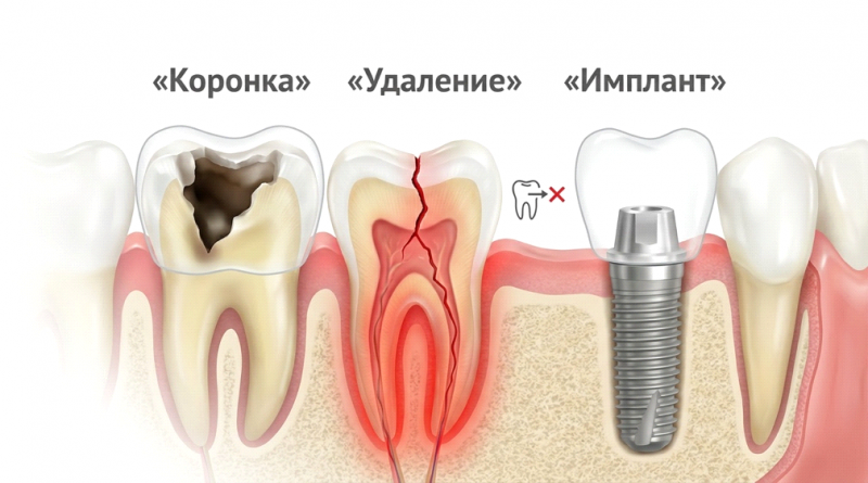 Коронка требует живого или пролеченного корня, который надёжно держится в кости. Имплант нужен, если корень треснул вдоль, разрушен до уровня десны, есть хроническое воспаление вокруг верхушки или зуб уже удалён и место пустует.