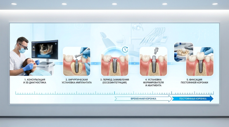 Этапы имплантации и установки коронки