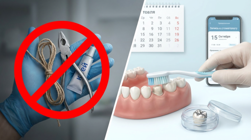 - Самостоятельные попытки снять или приклеить коронку дома опасны и могут привести к перелому зуба и инфекции.
