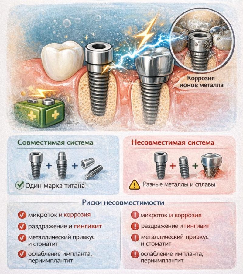 Смешение имплантов разных производителей и разнородных металлов повышает риск гальванического эффекта, механической несовместимости и потери гарантии на систему. Без веских клинических причин стоит придерживаться одной линии имплантов и абатментов, обсуждать выбор материала с имплантологом и хранить паспорта, сертификаты и выписки по установленным конструкциям.